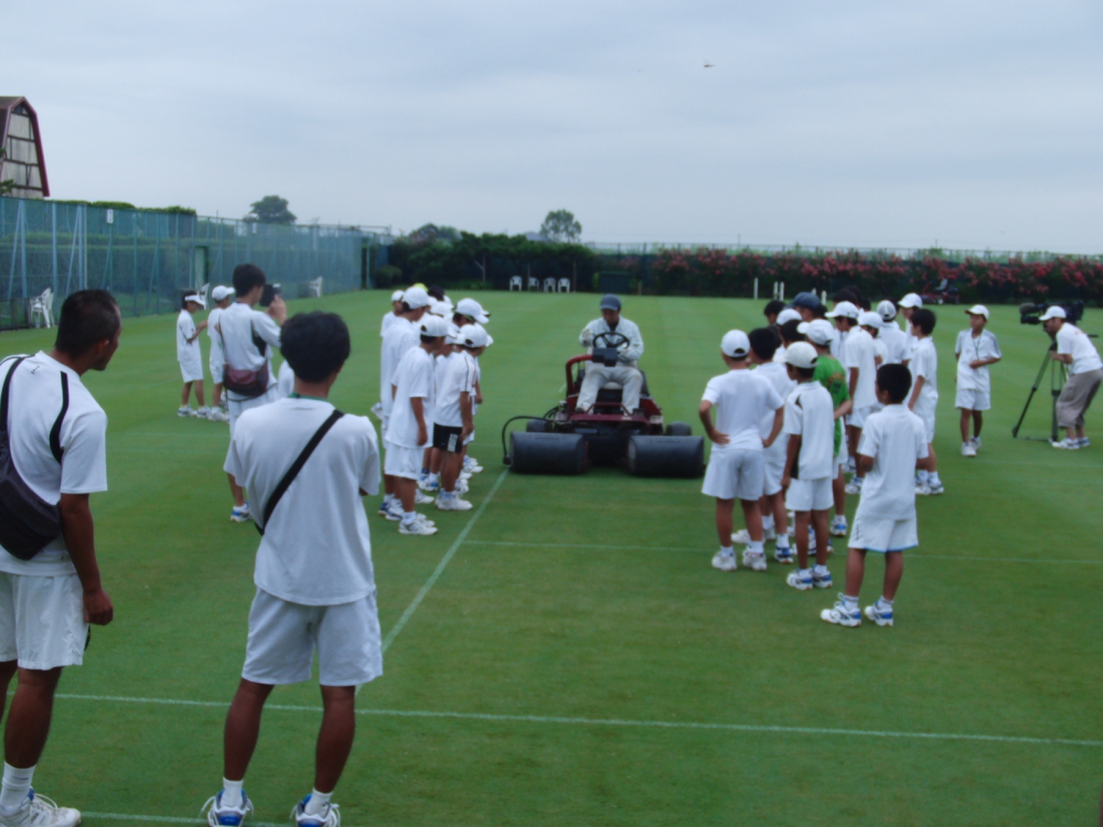 本日朝一番でグラスコートのメンテナンス見学を行いました。選手たちはコートキーパーさんの日々のご苦労を実感したことでしょう。